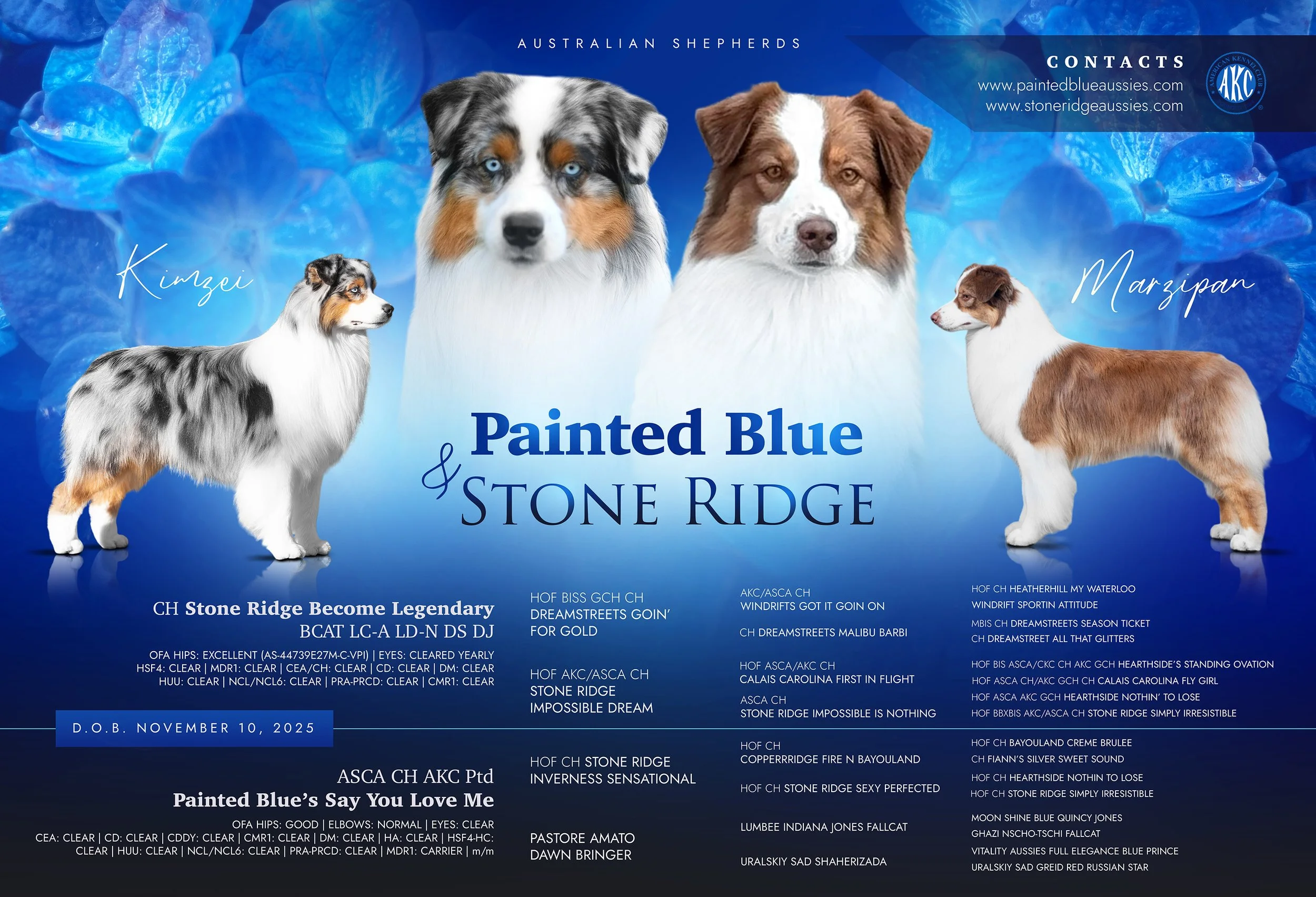 AKC / ASCA Australian Shepherd. Deposits are currently being accepted to hold your spot in line for puppy selections which will open up at 8 weeks of age.